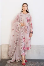 Crafted in a delicate blush palette, this digital printed lawn ensemble exudes grace. The shirt is adorned with subtle embroidered detailing along the neckline and borders, harmoniously blending with vibrant floral prints that give the piece a fresh appeal. The digitally printed lawn trouser complements the prints seamlessly. A beautiful embroidered cotton net dupatta completes the look.