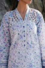 This ensemble is a testament to delicate artistry, featuring an intricately embroidered digital printed lawn on the front, complemented by a simple yet elegant digital printed lawn on the back and sleeves. The neckline and front & back borders are detailed with subtle embroidery, enhancing the fabric’s overall allure. The digital printed chiffon dupatta and embroidered cotton trouser completes the set, offering a seamless blend of style and comfort