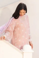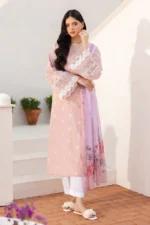 This ensemble features a softly embroidered lawn front paired with a dyed lawn back enhancing the delicate patterns. The lawn sleeves are accented with an embroidered border, adding a refined touch. The trousers are crafted from dyed cotton, and the set is completed with a digital printed chiffon dupatta, presenting a harmonious blend of subtle elegance.