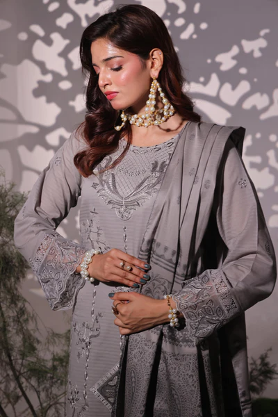 Exquisitely crafted with Luxury Heavy Chiken-Kari Embroidered Bana Dora Lawn, featuring fine needlework and traditional textures that exude sophistication.