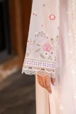 3PC ready-to-wear ensemble presents a long shirt detailed with multi-thread neckline embroidery, lace work, Chikankari sleeves, and 3D laser organza border patches, elevating it to a statement piece. The digital-printed dupatta with a 10-inch sequin border adds shimmering contrast, while the loose trousers with embroidered bottoms and an elasticized waistband offer effortless movement and a refined finish.