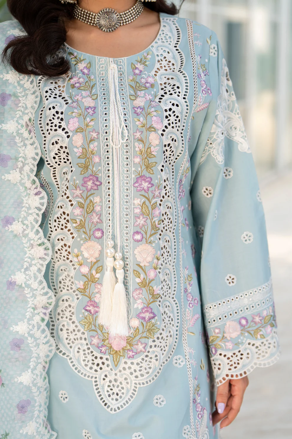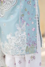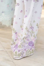 3PC ready-to-wear ensemble includes a short shirt accentuated by Chikankari multi-thread embroidery, organza cut-work patches and dori, tassel detailing on the neckline, and lace work, exuding intricate craftsmanship. Complementing it is a digital-printed dupatta with embroidery circling its edges, while the fully embroidered Farshi shalwar trousers with an elasticized waistband complete the look in effortless elegance.