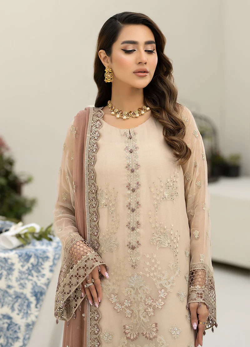 - embroidered chiffon is featured on the front, back, and sleeves, as well as a matching chiffon dupatta. The front and back are adorned with an embroidered organza border, while the sleeves have their own intricate organza borders. Completing the look is a pair of dyed Raw Silk trousers