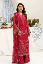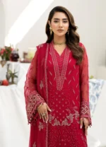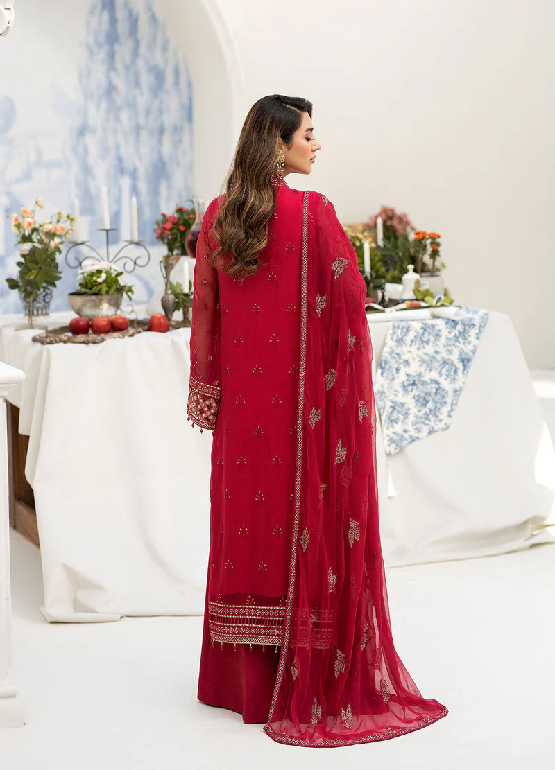 - embroidered chiffon is featured on the front, back, and sleeves, as well as a matching chiffon dupatta. The front and back are adorned with an embroidered organza border, while the sleeves have their own intricate organza borders. Completing the look is a pair of dyed Raw Silk trousers