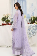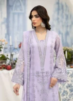 embroidered chiffon is featured on the front, back, and sleeves, as well as a embroidered chiffon dupatta. The front and back are adorned with an embroidered organza border, while the sleeves have their own intricate organza borders. Completing the look is a pair of dyed Raw Silk trousers.