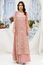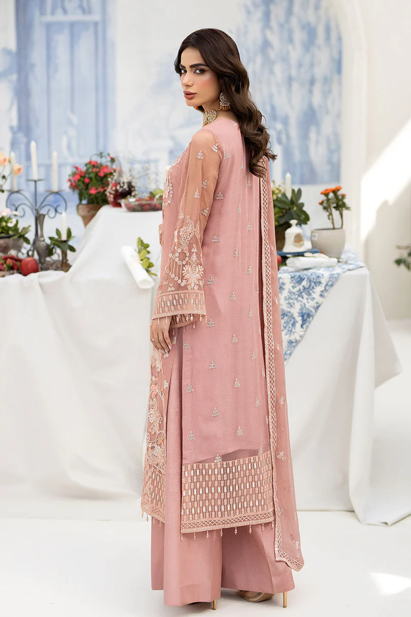 - embroidered chiffon is featured on the front, back, and sleeves, as well as a matching chiffon dupatta. The front and back are adorned with an embroidered organza border, while the sleeves have their own intricate organza borders. Completing the look is a pair of dyed Raw Silk trousers.