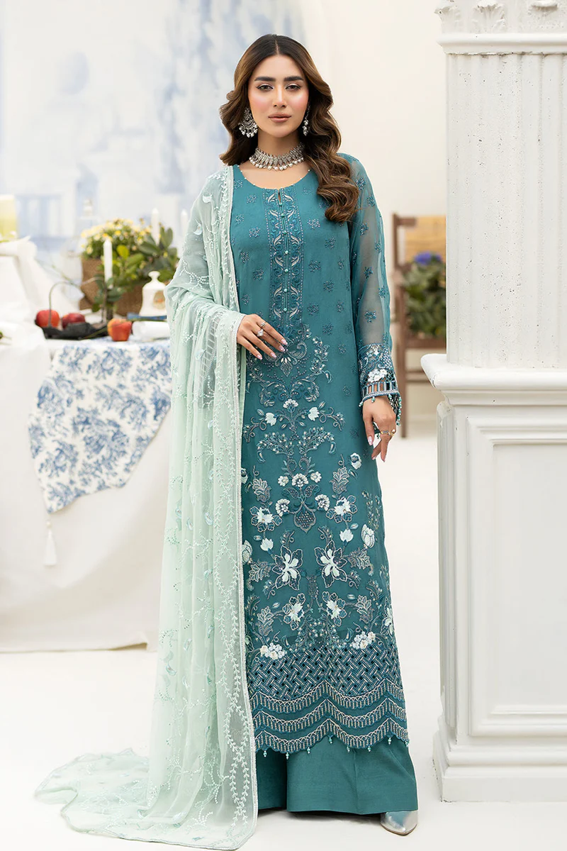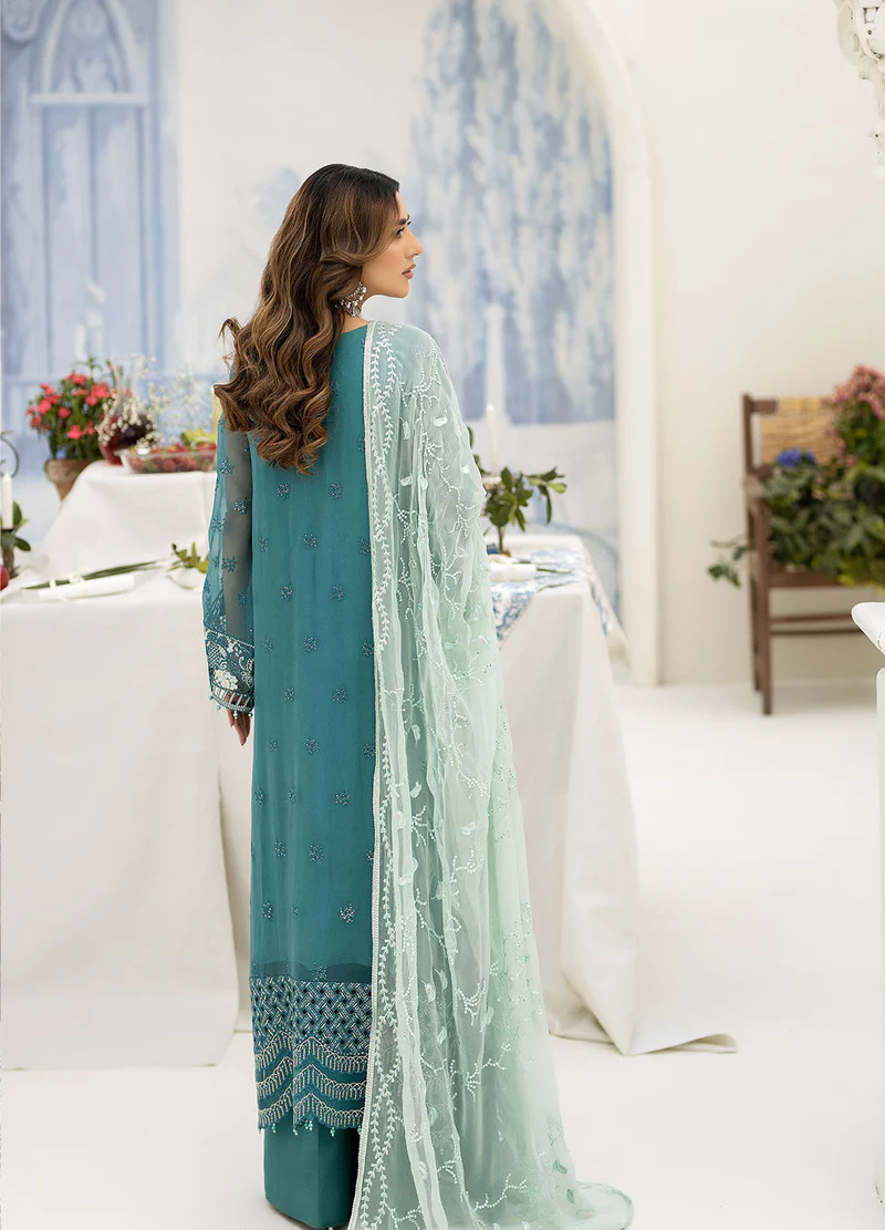 embroidered chiffon is featured on the front, back, and sleeves, as well as a embroidered chiffon dupatta. The front and back are adorned with an embroidered organza border, while the sleeves have their own intricate organza borders. Completing the look is a pair of dyed Raw Silk trousers.