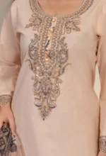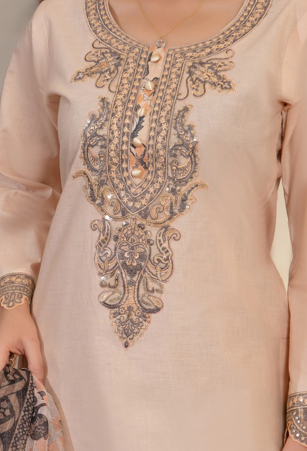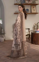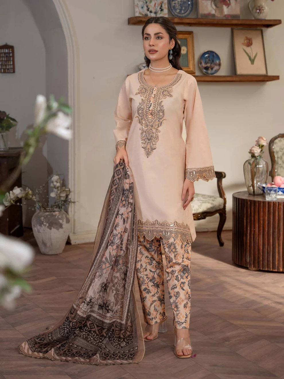 This ready-to-wear set includes a premium cotton long shirt, farshi shalwar, and diamond dupatta,