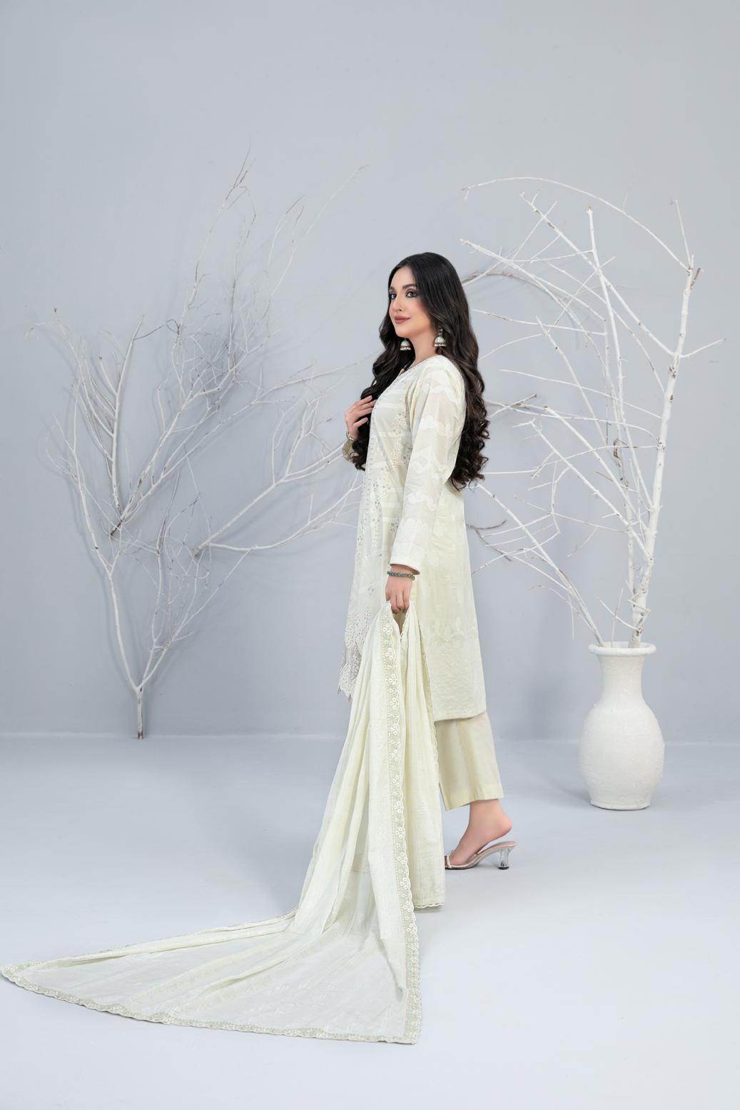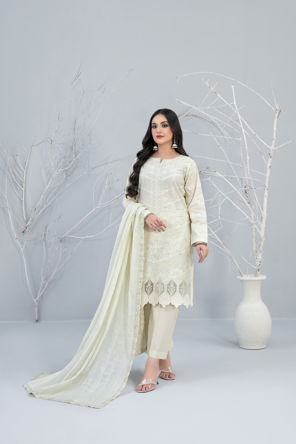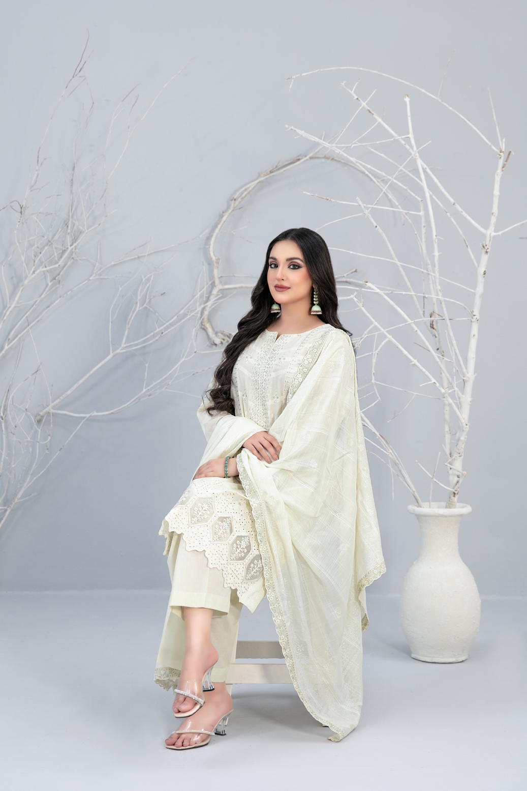 – Un-Stitched Embroidered Broshia Banarsi Lawn Shirt Designs - – Cutwork Embroidered Table Printed Slub Chiffon Dupatta