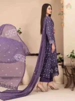 a stunning blend of tradition and trend. Part of the Tawakkal Lawn 2025 collection, this 3-piece unstitched suit offers elegance and comfort tailored for festive and everyday wear. Designed for women who appreciate refined embroidery and breathable fabric, this ensemble promises to be a timeless addition. The shirt features intricate jaal and daman embroidery over a digitally printed lawn base, showcasing delicate craftsmanship and vibrant artistry. Whether you’re preparing for Eid festivities or a summer gathering, this outfit ensures you feel effortlessly graceful. The embroidered & table-printed chiffon dupatta adds a lightweight, flowy texture with an artistic edge, while the plain cotton shalwar keeps the look balanced and practical.